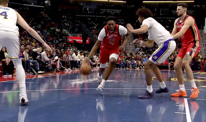 次节回来,霍金斯和贝互相助攻命中三分,鹈鹕将分差缩小至2分。里夫斯突破空中与奎因对抗后出手造犯规,鹈鹕主帅忍无可忍,满面怒容选择挑战最终成功改判,今天裁判确实抢戏。东契奇弧顶迎着防守三分命中,投进本场首个运动战进球,接着保护篮板后送出超远四分卫精准长传,拉拉维亚接球一打零轻松扣篮得手,湖人重新领先到7分。琼斯和阿尔瓦拉多连续三分打铁,东契奇持球反击,追身三分干拔再中,次节已砍下13分。东契奇突破摆脱包夹,助攻艾顿完成空接双手扣篮,半场战罢,湖人65-52领先鹈鹕13分。